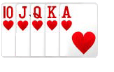 ROYAL FLUSH : kombinasi kartu ini adalah tingkatan tertinggi dalam permainan Poker, angka pada kartu harus berurut dengan angka tinggi, yaitu 10 ♠¨C J ♠¨C Q ♠¨C K ♠¨C As ♠dengan bunga yang sama (tidak boleh beda), contoh lain : 10 ♥ ¨C J ♥ ¨C Q ♥ ¨C K ♥ – As ♥